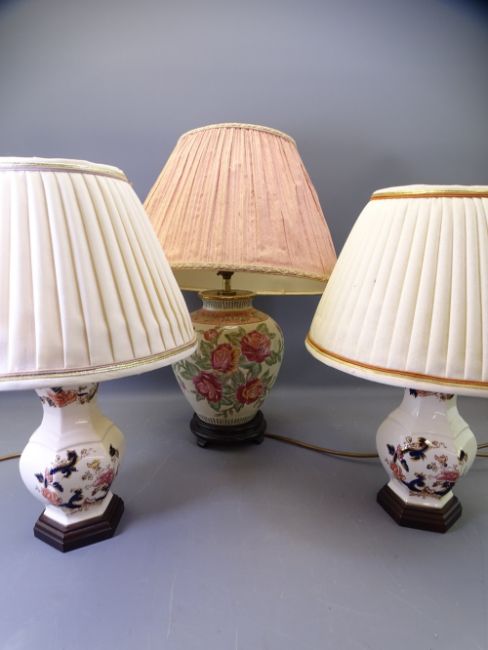 MASONS MANDALAY TABLE LAMPS, A PAIR, 29cms tall (plinth to top of fitting) with shades and another ceramic table lamp