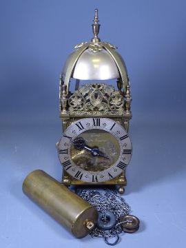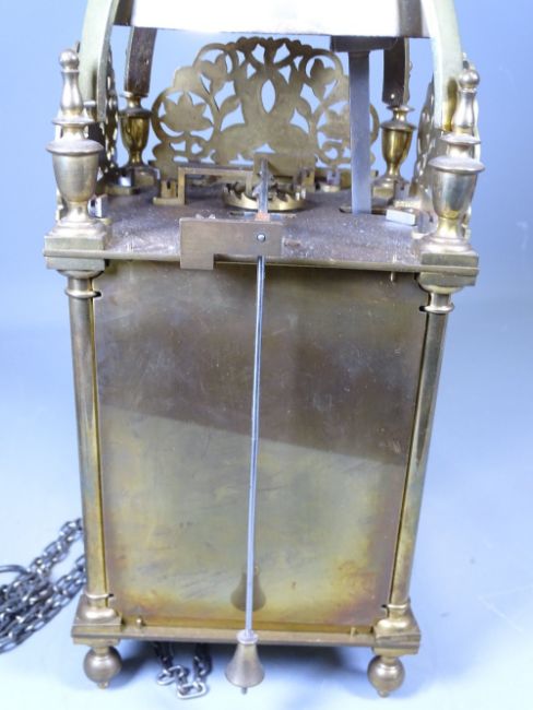 BRASS LANTERN CLOCK by Dent of London, single chain weight and Roman numeral dial, 39cms H