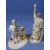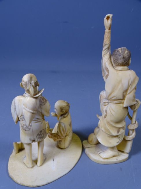 CIRCA 1920 JAPANESE IVORY OKIMONO (2), sectional figurines depicting a startled man with a snake coiled around his axe, 15.5cms H and a two-part group of men mounted on an oval base, 10.5cms H, 10cms across (some losses, additions) both with character markings to the bases