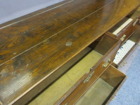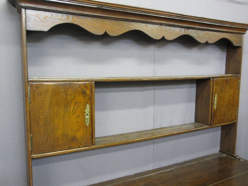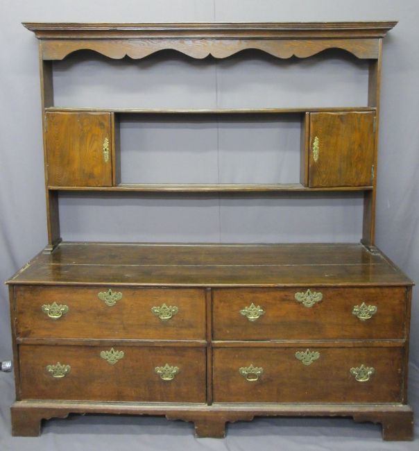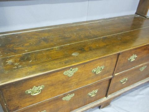 19TH CENTURY & LATER FOUR DRAWER DRESSER with cupboard rack, fancy pierced brasswork with swan neck handles on oak lined drawers, 188cms H, 177cms W, 68cms D