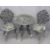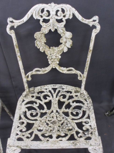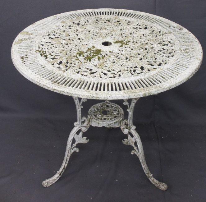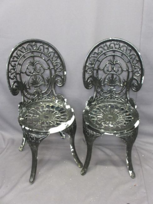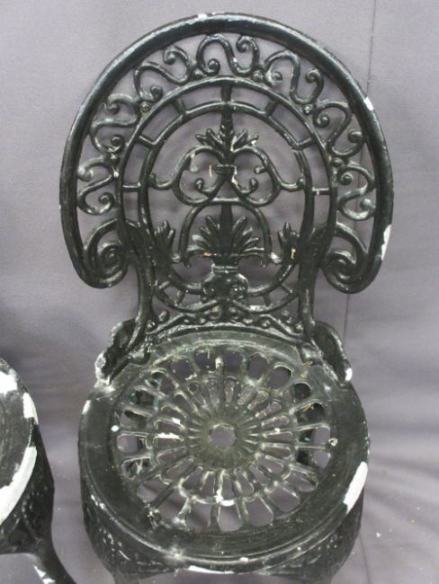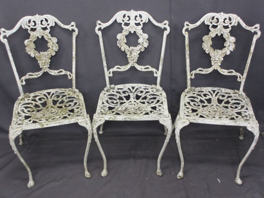 VINTAGE METAL GARDEN FURNITURE - a parcel of two metal tables, 69cms H, 80cms D and 65cms H, 61cms D, seven chairs and a vintage scythe ETC