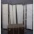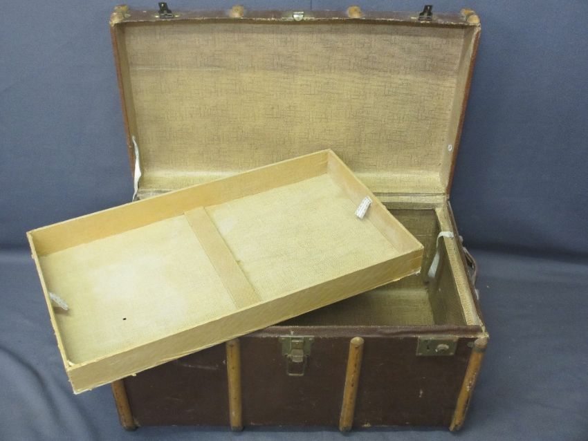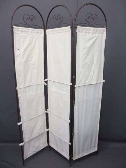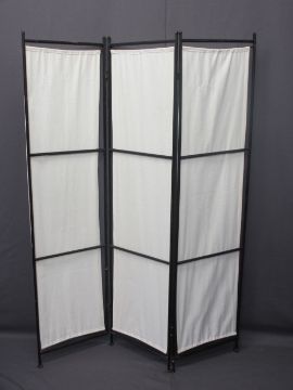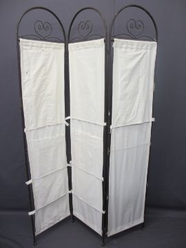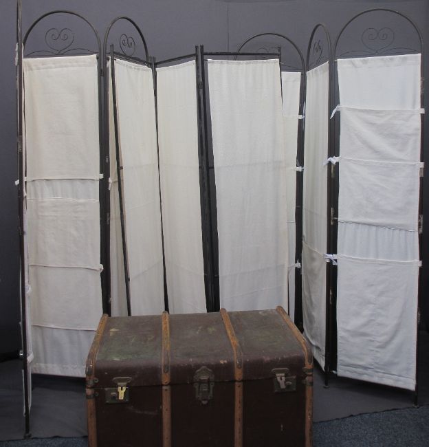 WOODEN BANDED TRAVEL TRUNK and three tri-fold metal and canvas screens, 188cms H, 126cms W the largest open