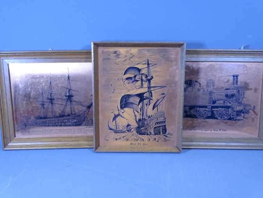 COOPERCRAFT COPPER ETCHING in a wooden frame 'Man of War' and two other similar, H M S Victory and G W R Steam Engine