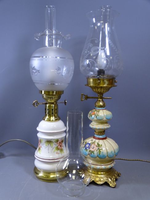 MAJOLICA & BRASS OIL LAMP CONVERTED E/T and another similar