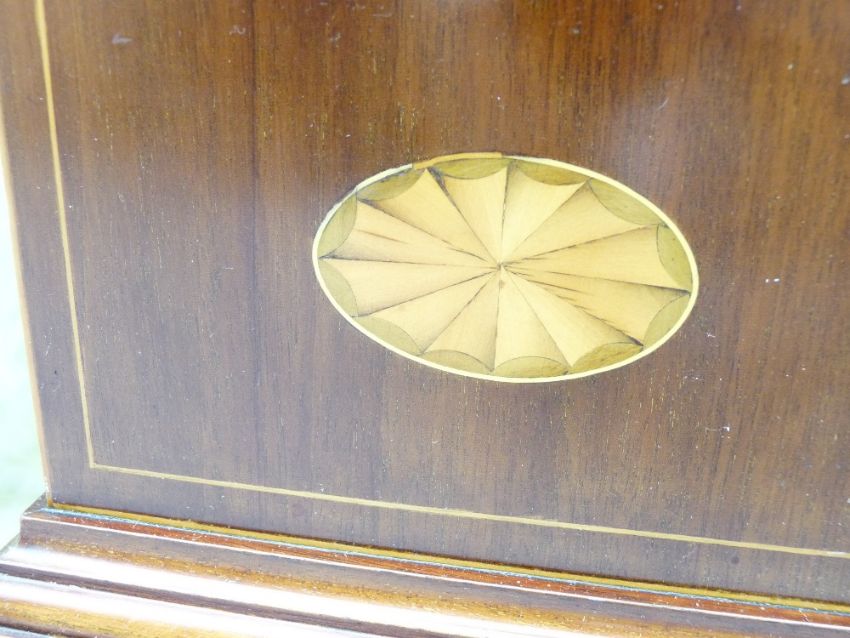 CLOCKS - a dome top mahogany mantle clock with inlaid shell to the centre, 35cms, and a mid-century mantle clock by Smiths