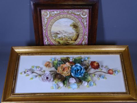 A TILE DEPICTING LANDSCAPE SCENE & PINK BORDER within a Rosewood frame, 27 x 27cms size overall and another floral plaque