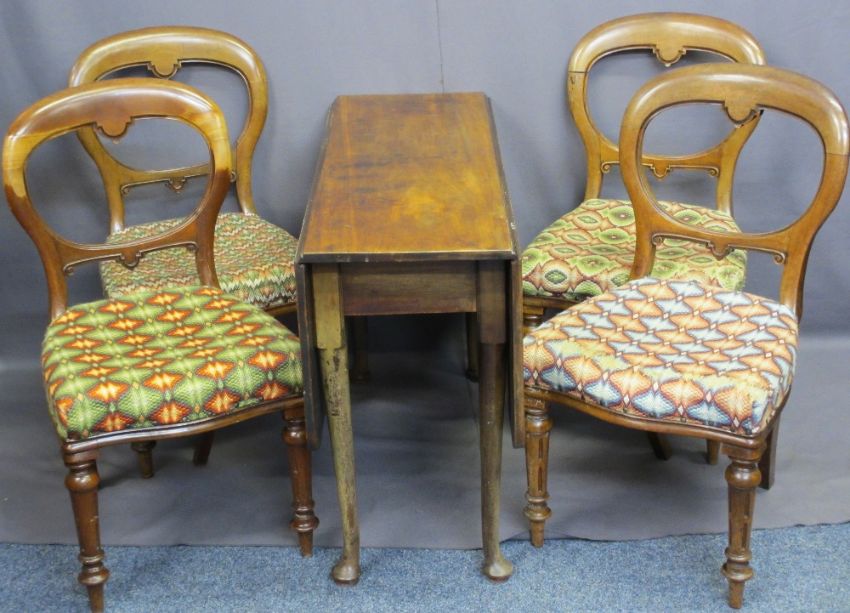 GEORGIAN PAD FOOT DROP-LEAF DINING TABLE, 72cms H, 112cms W, 106cms D open and four mahogany balloon back chairs, 89cms H, 48cms W, 45cms seat depth