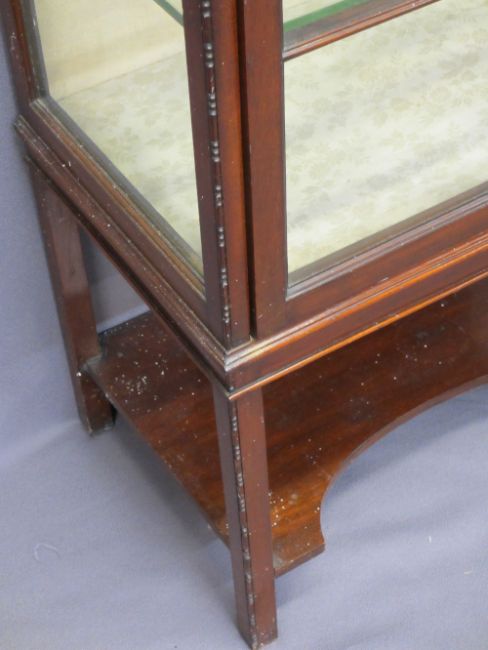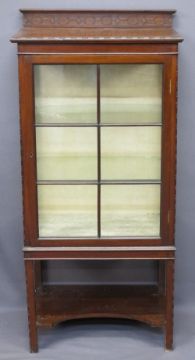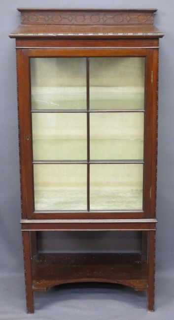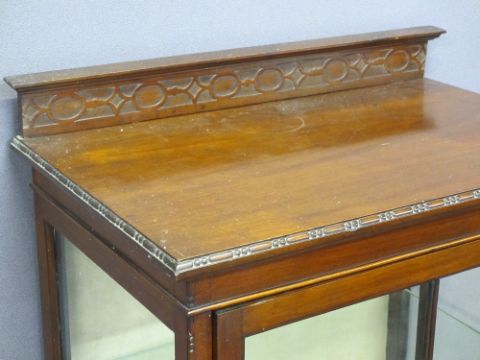 MAHOGANY CARVED RAILBACK DISPLAY CABINET, single door, carved edged detail with shaped lower shelf, 130cms H, 61cms W, 41cms D