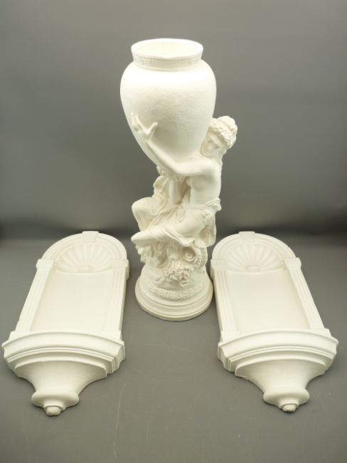PLASTER VASE IN THE FORM OF A MAIDEN, 64cms H and a pair of plaster wall pockets, 58cms H