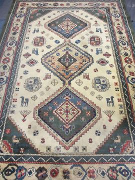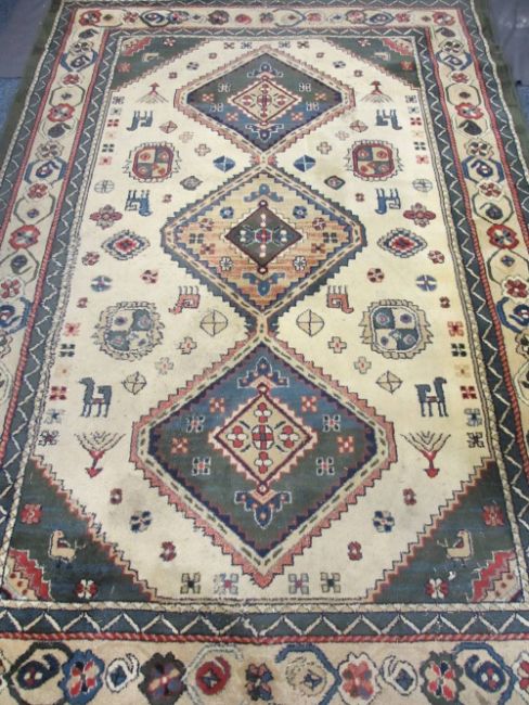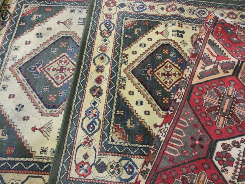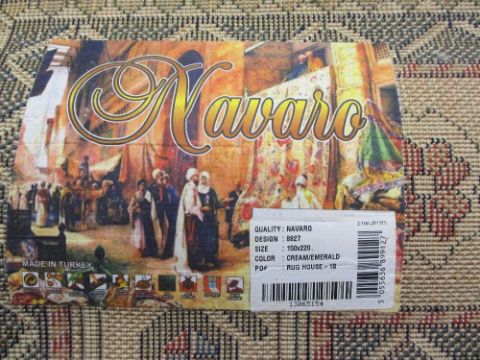 NAVARO HOUSEHOLD RUGS - a parcel, two cream and emerald, 180cms L, 70cms W and 150cms L, 220cms W and a woollen example, 188cms L, 115cms W