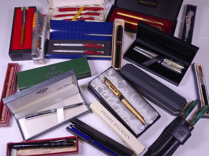 VINTAGE & LATER PENS, PEN & PENCIL SETS & BALLPOINTS, all in original boxes, makers include Platignum, Papermate, Francois Coty, Colibri, Pierre Balmain, Hightime, Silver Arrow and the Viaduct fountain pens along with a boxed Rotring Core Rollerball, 17 items in all