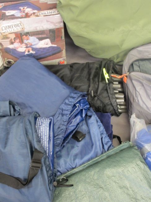 CAMPING EQUIPMENT to include Outwell 'Jersey M' pop-up tent and 'Montana 4' tent, Blacks 'Lupus' and other ground sheets, air bed ETC