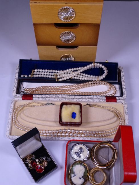 SILVER & COSTUME JEWELLERY in a small three-drawer chest, cameo type brooches and earrings, three simulated pearl necklaces, the silver includes a half chase decorated bangle, butterfly wing brooch and a stylised circular pendant on a multi-link chain