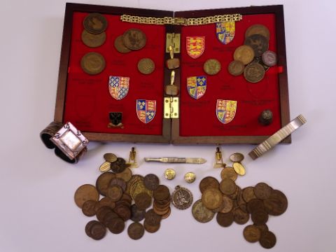 VINTAGE COINS, BADGES, GENTLEMEN'S CUFFLINKS ETC to include a solid silver St Christopher with various forms of transport in relief verso, a part collected Kings and Queens of Great Britain badges set and other items of interest
