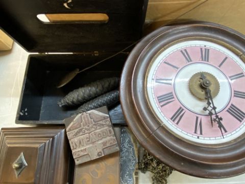 POSTMAN'S ALARM with weights and pendulum, treen boxes, printer's stamp ETC