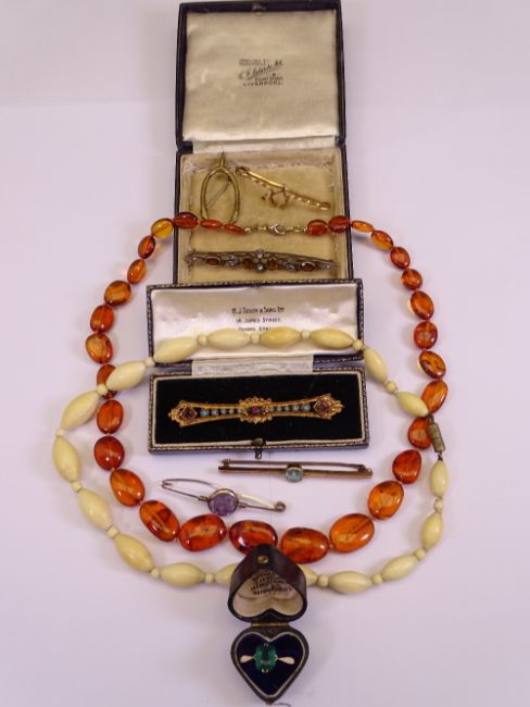VICTORIAN & LATER 9CT GOLD & OTHER JEWELLERY to include a 9ct gold bar brooch set with single aquamarine colour stone, 9ct gold ring with emerald cut green stone, size mid R - S, gilt metal bar brooch with turquoise and amethyst effect settings, other bar brooches along with ivory and amber type necklaces