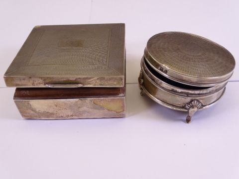 TWO HALLMARKED SILVER BOXES including a square cedar lined cigarette box with engine turn lid decoration, Birmingham 1951, 8.5cms square and a circular dressing table trinket box on four feet, Birmingham 1906