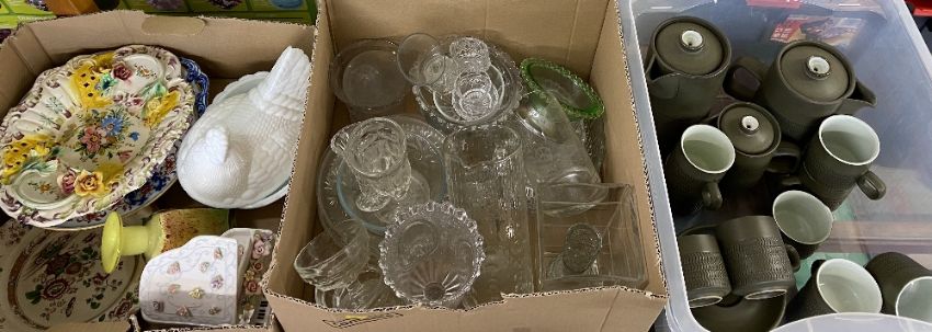 DENBY COFFEEWARE approximately 20 pieces, a Milk glass 'hen on nest' and an assortment of glass and chinaware