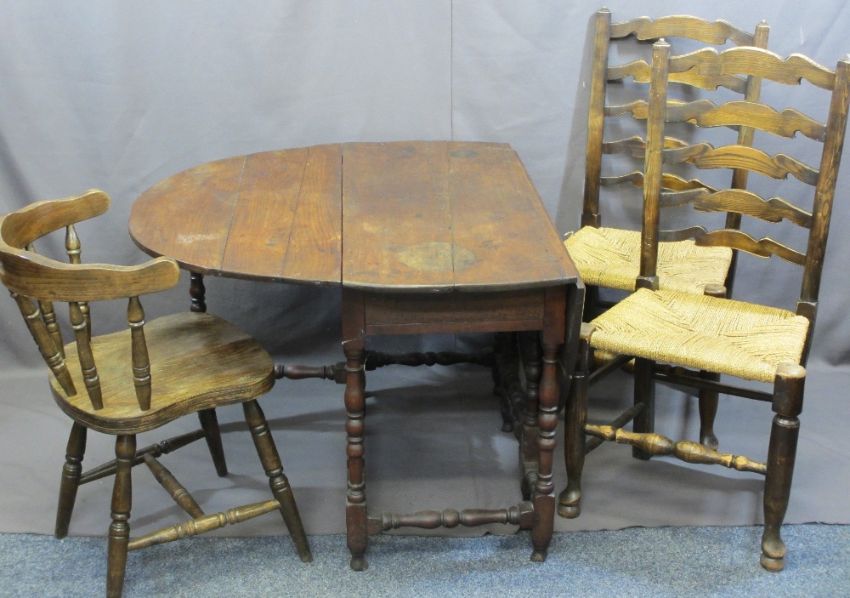 ANTIQUE OAK GATE-LEG DINING TABLE, two ladderback chairs, string seated and a modern smoker's bow type chair, 68.5cms H, 107cms W, 137cms L fully open the table