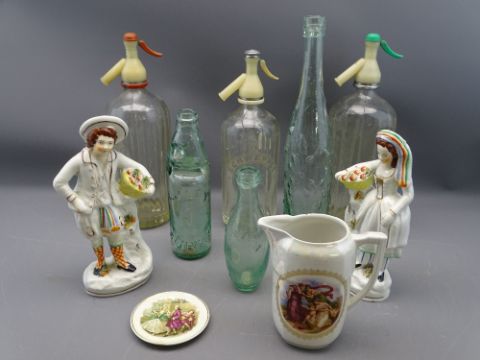 VINTAGE SODA SYPHONS COMMEMORATIVE FOR SCHWEPPES and two others also soda bottles, Staffordshire figures ETC