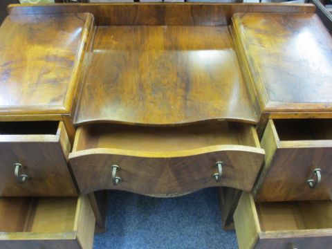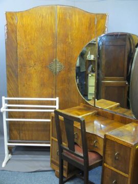 VINTAGE WALNUT & OTHER HARLEQUIN BEDROOM SUITE consisting of two-door wardrobe with carved swag detail, 193cms H, 127cms max W, 48cms D, triple mirrored dressing chest, 162cms overall H, 105cms W, 47cms D, an oak chair, a painted towel rail and two bedside pot cupboards