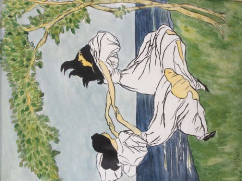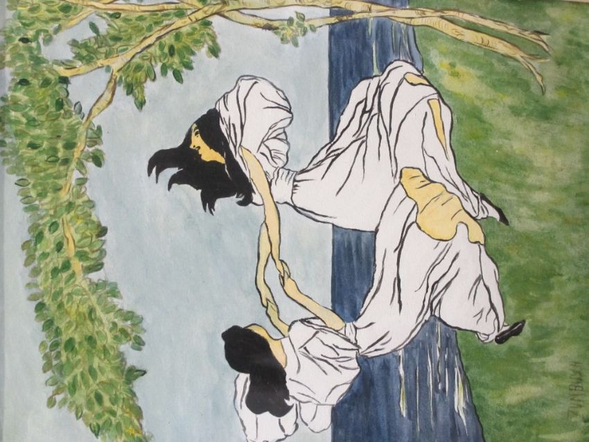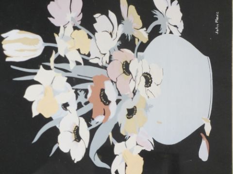ZUN BUSCH watercolour - 'Dancers', signed, 27 x 21cms, JOHN MACE print - flowers in vase, signed, 24 x 19cms along with Alpine scene in a porthole, 22cms diameter, two Art Deco frame portraits and an embossed bird amongst foliage plaque, 27 x 35cms