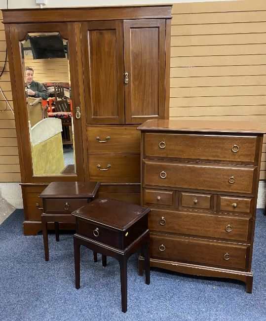 EDWARDIAN MAHOGANY COMBINATION WARDROBE, 200cms H, 135cms W, 50cms D, STAG MINSTREL narrow multi-drawer chest, 112cms H, 81cms W, 47cms D, a pair of single drawer bedside chests and a bed head