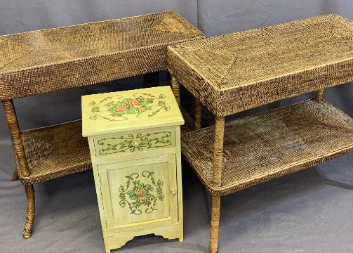 FURNITURE ASSORTMENT - a pair of wicker two-tier side tables, 75cms H, 83cms W, 40cms D and a painted bedside cabinet