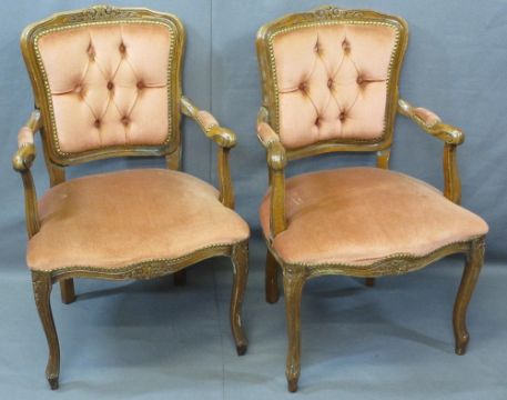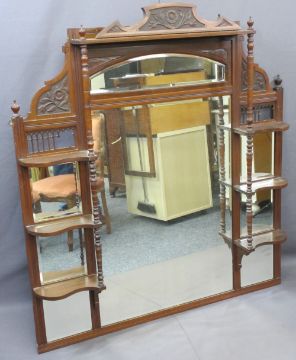 EDWARDIAN OVERMANTLE MIRROR and two reproduction button back upholstered armchairs, 135.5cms H, 118.5cms W, 14cms D the mirror