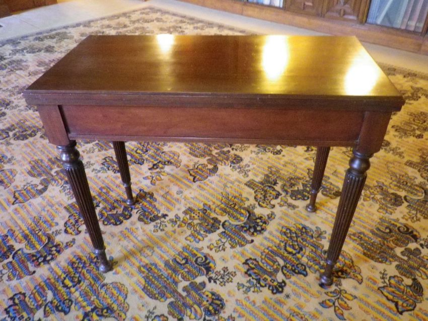 REGENCY MAHOGANY FOLDOVER CARD TABLE, the rectangular top opening in twist format to reveal a baize lined interior and dished corner trays over an interior well on turned and reeded supports, 75.5cms H, 92cms W, 45.5cms D closed, 91 x 91cms fully open