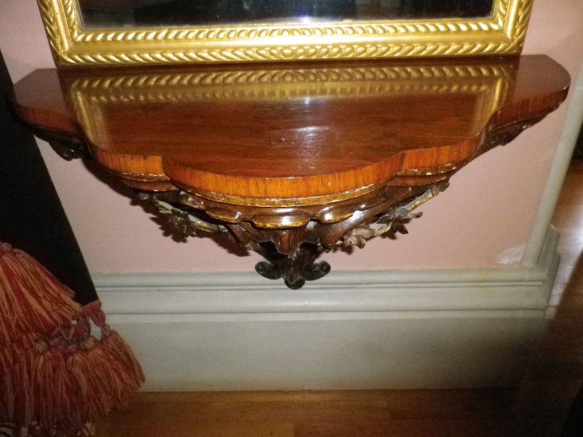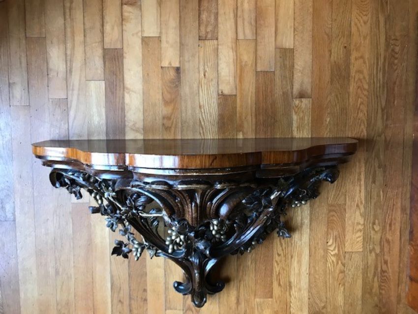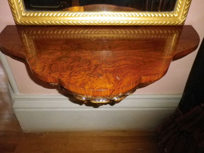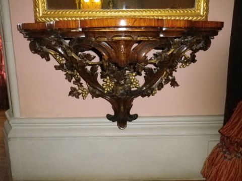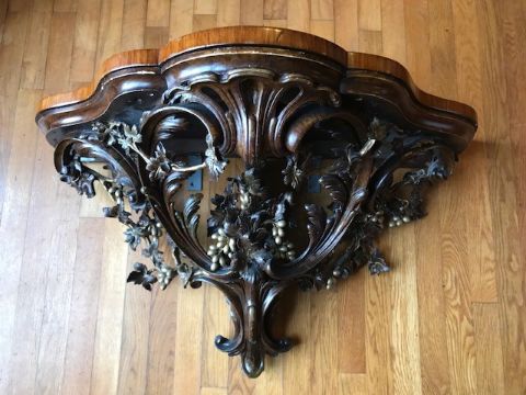 AMENDED DESCRIPTION: BURR WALNUT & COMPOSITE MOULDED WALL MOUNT PIER CONSOLES, a pair having shaped tops over an open sinuous bracket with berry and leaf carving, 53cms H, 92cms W, 46cms D