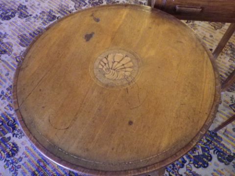 ANTIQUE & LATER SIDE TALBES (3) to include a circular top crossbanded and inlaid mahogany side table with shaped under-tier shelf, 66cms H, 68cms D, Condition: various veneer losses, repolishing required, a mid-century single drawer side table, 79cms overall H including railback, 61cms W, 38cms D, Condition: repolishing required, and an Edwardian mahogany kidney shape side table with crossbanded and strung inlay edging on slender line inlaid supports with X frame stretcher, 71cms H, 66cms W, 39cms D