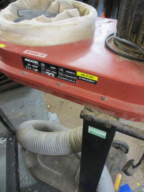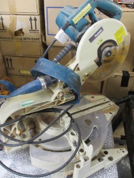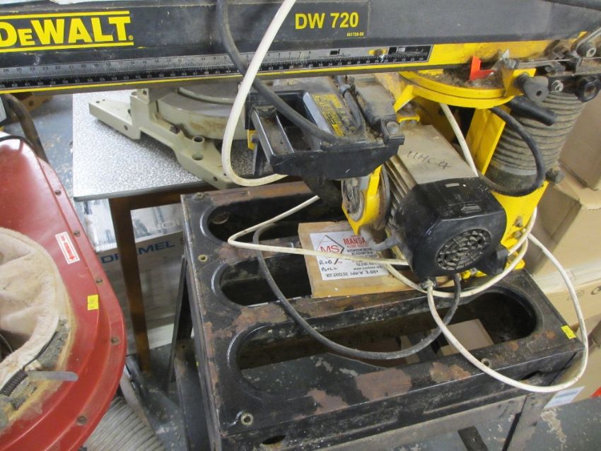 DeWALT DW720 CROSS CUTTING SAW ON A METAL STAND and a Makita Mitre saw and a large capacity dust extractor E/T
