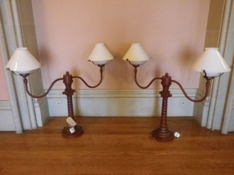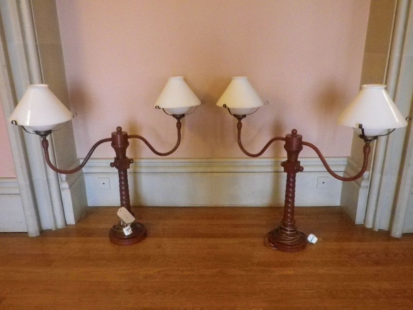 REPRODUCTION SCUMBLED METAL TWIN BRANCH LAMPS in the form of vintage wig stands with white glass shades, 96cms overall H, 110cms max overall W