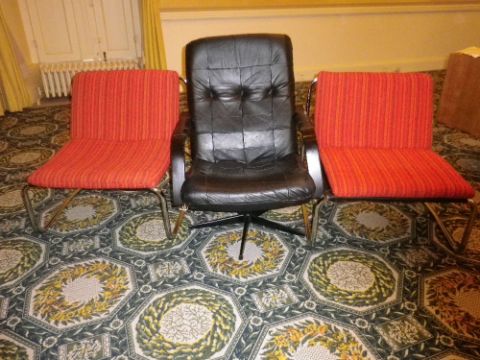 MID-CENTURY CHROME & UPHOLSTERED COMFORT CHAIRS and a vintage style black leather effect swivel armchair, 72cms H, 69cms W, 49cms seat depth and 90cms H, 65cms W, 54cms seat depth, measurements respectively