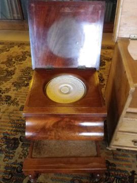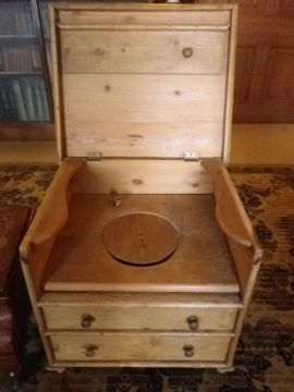 Condition Report: Pine commode has old visible signs of worm, one knob requires reattaching, mahogany commode needs repolishing in parts
