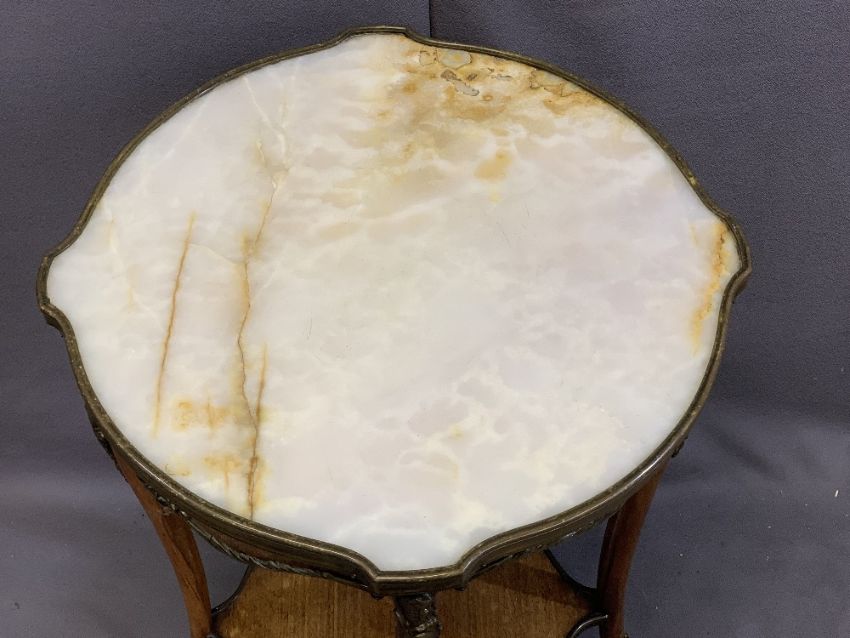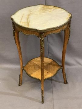 FRENCH STYLE KINGWOOD MARBLE TOP TWO-TIER OCCASIONAL TABLE with brass mounts, 74.5cms H, 45 x 45cms top