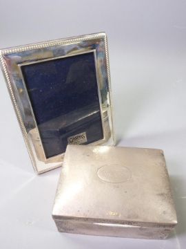 PRESENTATION SILVER CIGARETTE BOX and a modern Carrs sterling silver photograph frame, Birmingham 1904, maker Deakin & Francis Ltd, 12cms across, inscription reads 'Presented to R G Evans Esq MBE JP by colleagues and staff, North Wales Preparation Department NCB on his retirement 1960', the frame Sheffield 2002, 16.5 x 13cms