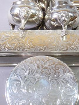 SILVER TOPPED DRESSING TABLE POTS (2) and a quantity of EPNS Arthur Price and other cruets, the dressing table items having glass bases, the silver lids chase decorated with leopard type crest to the central cartouches, London 1846, 3.1 troy ozs gross weighable, the four Arthur Price of England cruets consisting of two salt and two pepper pots on three lion mask and paw feet along with a further pair having leaf and berry decoration