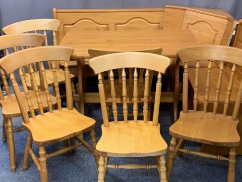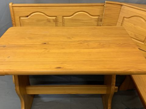 MODERN PINE KITCHEN FURNITURE ENSEMBLE to include a corner bench with box seats, 87cms H, 117cms longest L and 76.5cms the shorter section, 51cms D, rectangular top kitchen table, 76.5cms H, 110cms L, 70cms D and six spindle back farmhouse kitchen chairs, 86cms H, 41cms W, 37cms seat depths