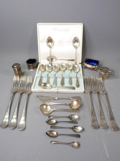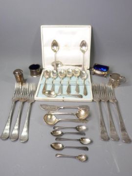 MIXED QUANTITY OF SILVER & EPNS WARE to include four various hallmarked silver condiment items and seven various spoons and loose quantity of EPNS cutlery, various hallmarks, 7.4 troy ozs weighable