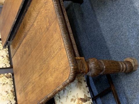 VICTORIAN CARVED OAK EXTENDING DINING TABLE and 8 (6+2) later oak dining chairs, the table with wind-out action (winder missing) plus two additional leaves, 73cms H, 147cms L closed, 120cms W, the additional leaves, 43.5cms and 42.5cms giving an overall length of 233cms, the chairs with upholstered backs and seats with brass button detail, on turned and block front supports, 97cms H, 54cms W, 47cms seat depth the carvers, 97cms H, 48cms W, 43cms seat depth the others
