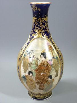 SATSUMA NARROW NECKED BULBOUS VASE with three panels depicting figures at work/play, 18.5cms H