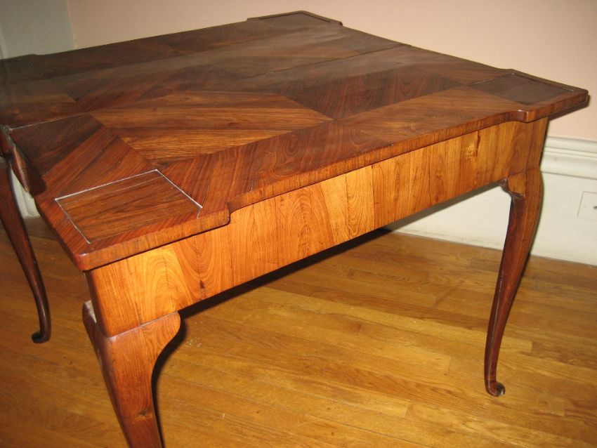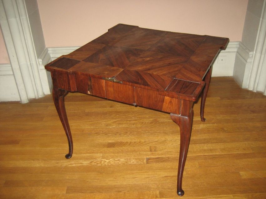 ROSEWOOD GAMES TABLE - with finely grained foldover top having a folding base on cabriole supports, 86cms square opened