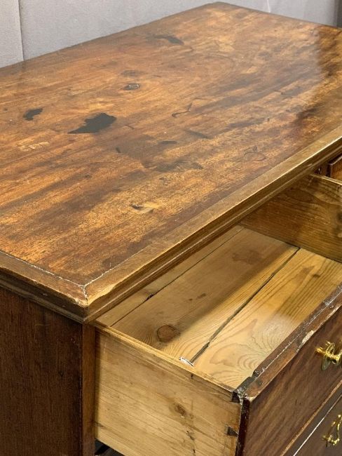 GEORGIAN MAHOGANY CHEST of two short over three long drawers, pine lined with replacement brass circular pommels and swan neck handles on corner bracket feet, 106cms H, 115.5cms W, 56cms D (slight losses to the top beading, part loss to one foot, breaks and losses to some sections of the cock beading)