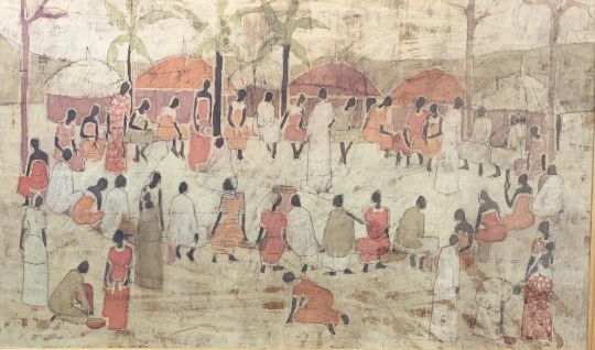 COLOUR PRINTED TINT ON FABRIC - African village scene, 67.5 x 115cms