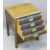 VINTAGE OAK FOUR DRAWER COIN COLLECTOR'S CABINET, the drop-down front opening to reveal four glass covered drawers with inset brass campaign style handles, the top drawer containing a small selection of vintage British and overseas coinage, the whole standing on square supports, 56cms H, 45.5cms W, 40cms D
