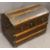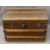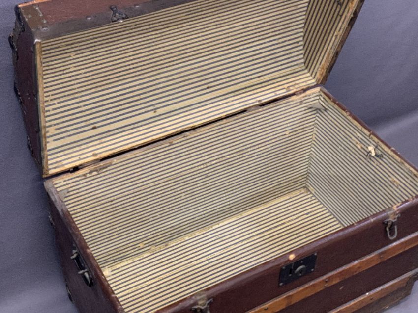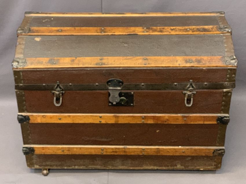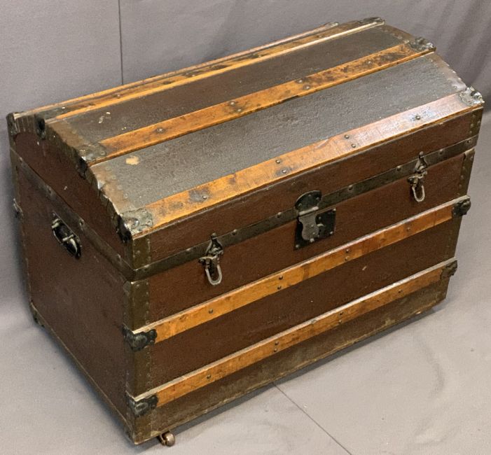 DOME TOP TRUNK, wooden banded, on castors, metal cuppings and handles, 58cms H, 78cms W, 47cms D