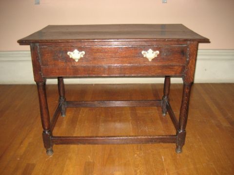 OAK SIDE TABLE, a twin plank oblong top with single narrow drawer having brass backplates and swing handles, turned and block supports and plain stretchers, 97cms W
