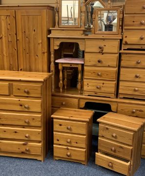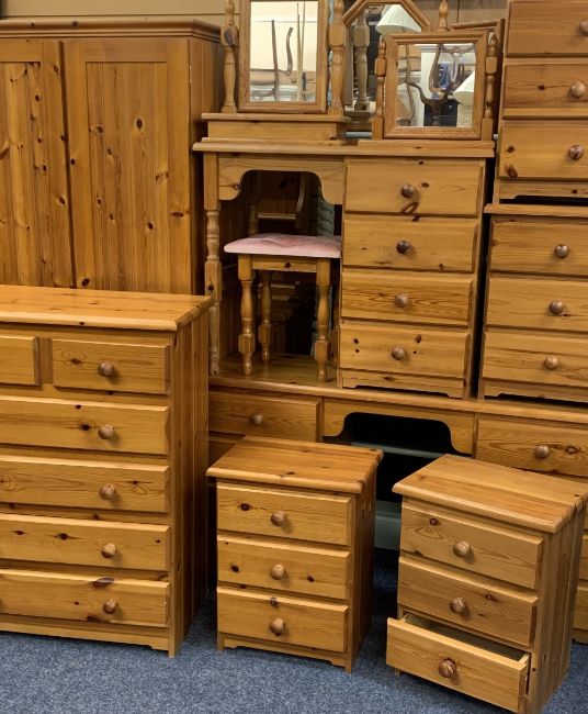 EXTENSIVE GROUP OF MODERN PINE BEDROOM FURNITURE ITEMS (11) to include a two door wardrobe, 183cms H, 89cms W, 55cms D, long dressing table with pedestal sets of four drawers, 74cms H, 136cms W, 43.5cms D, smaller dressing table with triple mirror, 117cms overall H, 91cms W, 44cms D, two short over four long drawer chest, 102cms H, 76cms W, 45cms D, two further small dressing mirrors and four three drawer sets of bedside chests, 58.5cm heights approx, 45cm widths, 33cm depths approximately, plus pine double bed frame and two singles
